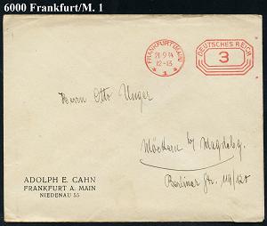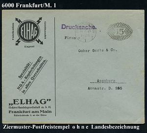 490 | 15 € | 6 Frankfurt/M. Post-Freistempel : FRANKFURT (MAIN)/ * 1 II/ 15 1921 (14.7.) PFS 15 Pf. Ziermuster, schwarz auf dekorativem Firmen-Bf.: ELHAG.. Elektro-Handelsges. m.b.H. (Blitz-Logo) n. Augsburg (Dü.D-1, Nr.2, UZ II) | ![]() | |