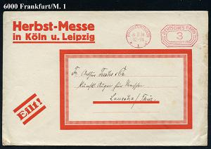 493 | 12 € | 6 Frankfurt/M. Post-Freistempel : FRANKFURT (MAIN(/ * 1 II/ DEUTSCHES REICH 1924 (8.8.) PFS3 Pf. "Achteck" auf Reklame-Bf.: Herbst-Messe in Köln u. Leipzig (Dü.D-4) | ![]() ![]() | |