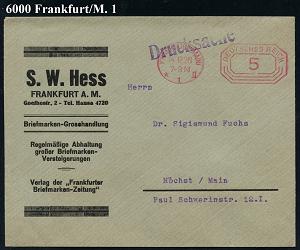 500 | 6 € | 6 Frankfurt/M. Post-Freistempel : FRANKFURT (MAIN)/ * 1 II/ DEUTSCHES REICH 1928 (14.12.) AFS 5 Pf. "Achteck" auf Firmen-Bf.: S. W. Hess.. Briefmarken-Gro0handlung.. Verlag der "Frankfurter Briefmarken-Zeitung", Inl.-Drs. (Dü.D-4) | ![]() ![]() | |