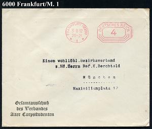 515 | 14 € | 6 Frankfurt/M. Post-Freistempel : FRANKFURT (MAIN)/ * 1 */ DEUTSCHES REICH 1932 (3.8.) PFS 4 Pf. "Achteck" auf Vordruck-Bf.: Gesamtausschuß des Verbandes Alter Corpsstudenten, rs. Abs.-Vordruck: Dr. Heringhaus.. (Dü.D-4) | ![]() ![]() ![]() | |