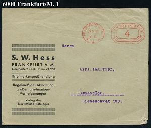 519 | 6 € | 6 Frankfurt/M. Post-Freistempel : FRANKFURT (MAIN)/ *1*/ DEUTSCHES REICH 1933 (22.8.) PFS 4 Pf. "Achteck" auf Firmen-Bf.: S. W. Hess.. Briefmarkengroßhandlung.. (Dü.D-4) | ![]() ![]() | |