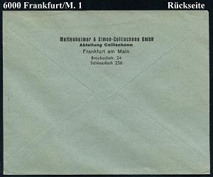 525 | 12 € | 6 Frankfurt/M. Post-Freistempel : FRANKFURT (MAIN)/ *1*/ DEUTSCHES REICH 1934 (18.10.) PFS 3 Pf. , rs. Abs.-Vordruck: Mettenheimer & Simon-Collischon GmbH, Abt. Collischon.. = jüdische Firma! (Dü.D-4) | ![]() ![]() ![]() | |