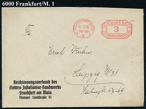 527 | 8 € | 6 Frankfurt/M. Post-Freistempel : FRANKFURT (MAIN)/ * 2 I/ DEUTSCHES REICH 1935 (10.10.) PFS 3 Pf. "Achteck" , Dienst-Bf.: Reichsinnungsverband des Elektro-Jnstallateur-Handwerks.. (Dü.D-4) | ![]() ![]() | |