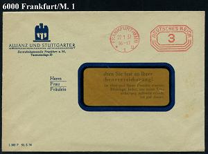 528 | 8 € | 6 Frankfurt/M. Post-Freistempel : FRANKFURT (MAIN)/ * 1 u/ DEUTSCHES REICH 1937 (22.1.) PFS 3 Pf. "Achteck" , Firmen-Reklame-Bf.: ALLIANZ U. STUTTGARTER LEBENSVERSICHERUNGSBANK.. (Logo) innen Reklame-Spruch (Dü.D-4) | ![]() ![]() | |