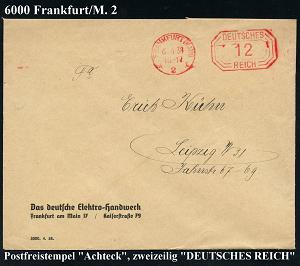 529 | 8 € | 6 Frankfurt/M. Post-Freistempel : FRANKFURT (MAIN)/ *2I/ DEUTSCHES/ REICH 1938 (16.3.) PFS 3 Pf. "Achteck" (zweizeilig) rs. Abs.: Wirtschaftsbund, Zweigstelle Frankfurt a. M.. (Dü.D-5) | ![]() ![]() | |