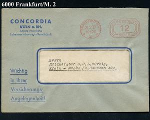 533 | 8 € | 6 Frankfurt/M. Post-Freistempel : FRANKFURT (MAIN)/ * 2 I/ DEUTSCHES REICH 1939 (21.2.) PFS 12 Pf. "Achteck" (zweizeilig) Firmen-Bf.: CONCORDIA; KÖLN a. RH... Lebensversicherungs-Ges., Fern-Bf.-Porto! (Dü.D-5) | ![]() ![]() | |