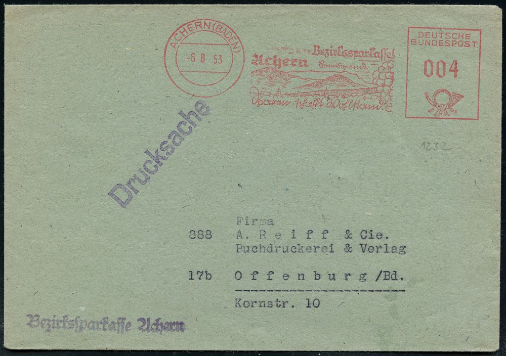 5029 | 12 € | POSTLEITRAUM 7500 (OHNE KARLSRUHE u. PFORZHEIM) : ACHERN (BADEN)/ Bezirkssparkasse/ Sparen.. 1953 (6.8.) AFS Francotyp "Posthorn" , Text teils Sütterlin (Weintraube u. Landschaft) Fern-Bf. (Dü.E-23CGo) | ![]() | |