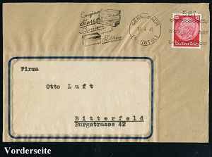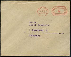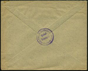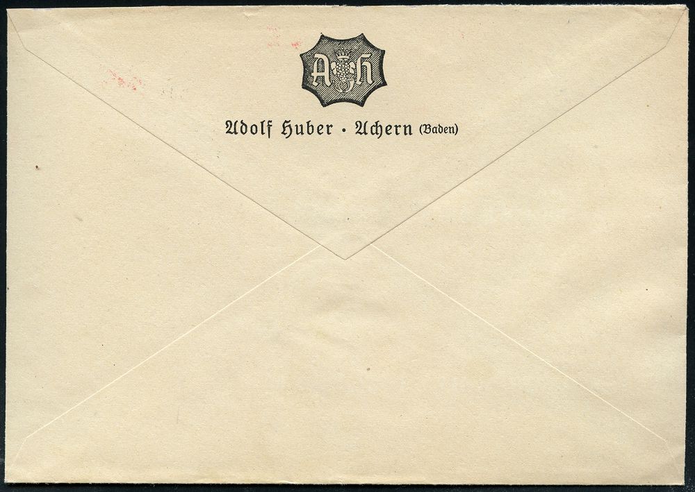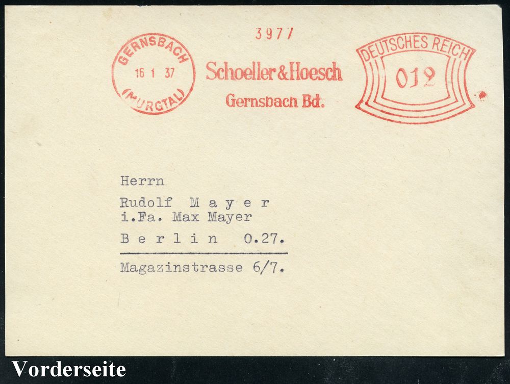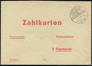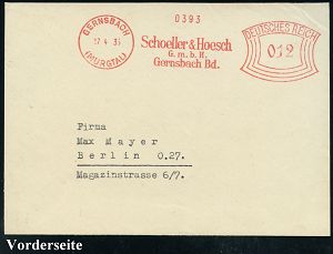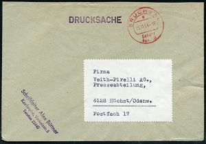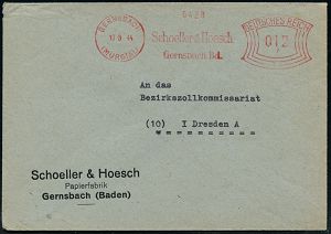 5134 | 18 € | POSTLEITRAUM 7500 (OHNE KARLSRUHE u. PFORZHEIM) : GERNSBACH/ (MURGTAL)/ Scholler & Hoesch.. 1944 (10.8.) aptierter AFS Francotyp "Bogenrechteck" mit CG-Ziffern! ("G.m.b.H." entfernt!) Firmen-Bf.: Scholler & Hoesch, Papierfabrik.. (rs. Klappenriß) später Kriegs-Beleg!, vergl. Kat.-Nr.5132 (Dü.E-1CGh) | ![]() | |