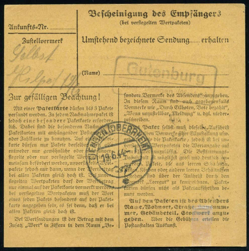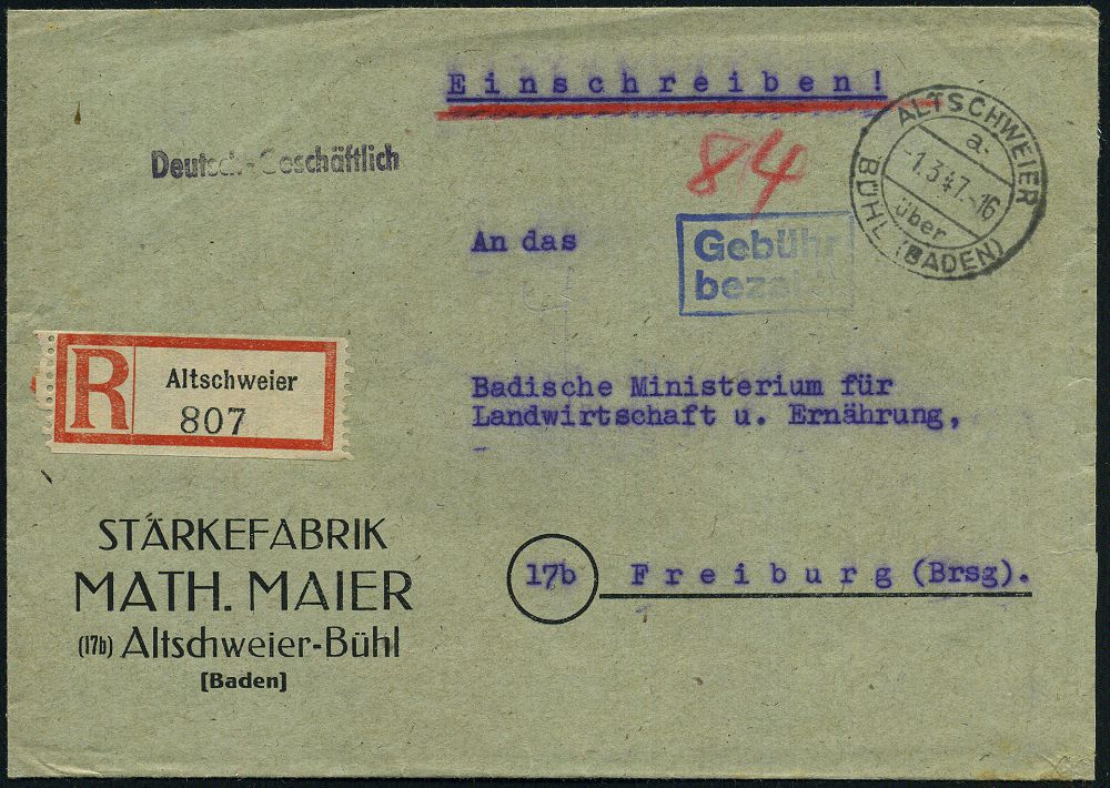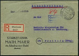5033 | 18 € | POSTLEITRAUM 7500 (OHNE KARLSRUHE u. PFORZHEIM) : ALTSCHWEIER/ a/ über/ BÜHL (BADEN) 1946 (1.3.) 2K-Steg = PSt.I + blauer Ra.2: Gebühr/bezahlt + hs. "84" (Pf.) + RZ: Altschweier , Firmen-Fern-R-Bf.: Stärkefabrik M. Maier n. Freiburg | ![]() | |