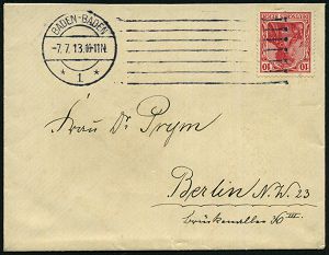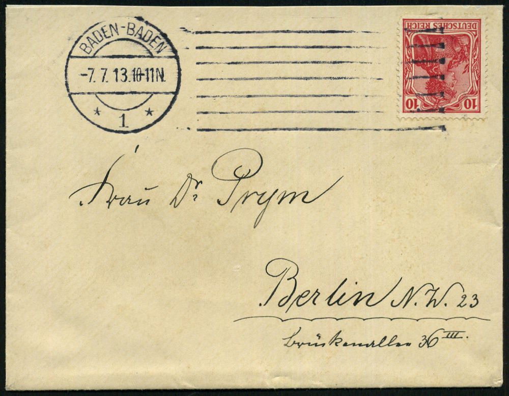 5035 | 25 € | POSTLEITRAUM 7500 (OHNE KARLSRUHE u. PFORZHEIM) : BADEN-BADEN/ *1* 1913 (7.7.) Maschinen-StrichSt Typ Bickerdike (8 lange Striche,61 mm, Miller 98) obere Linie nur Druckpunkt, Inl.-Bf., bei Miller bisher unbekanntes F r ü h d a t u m ! (Mi.86 I) | ![]() | |