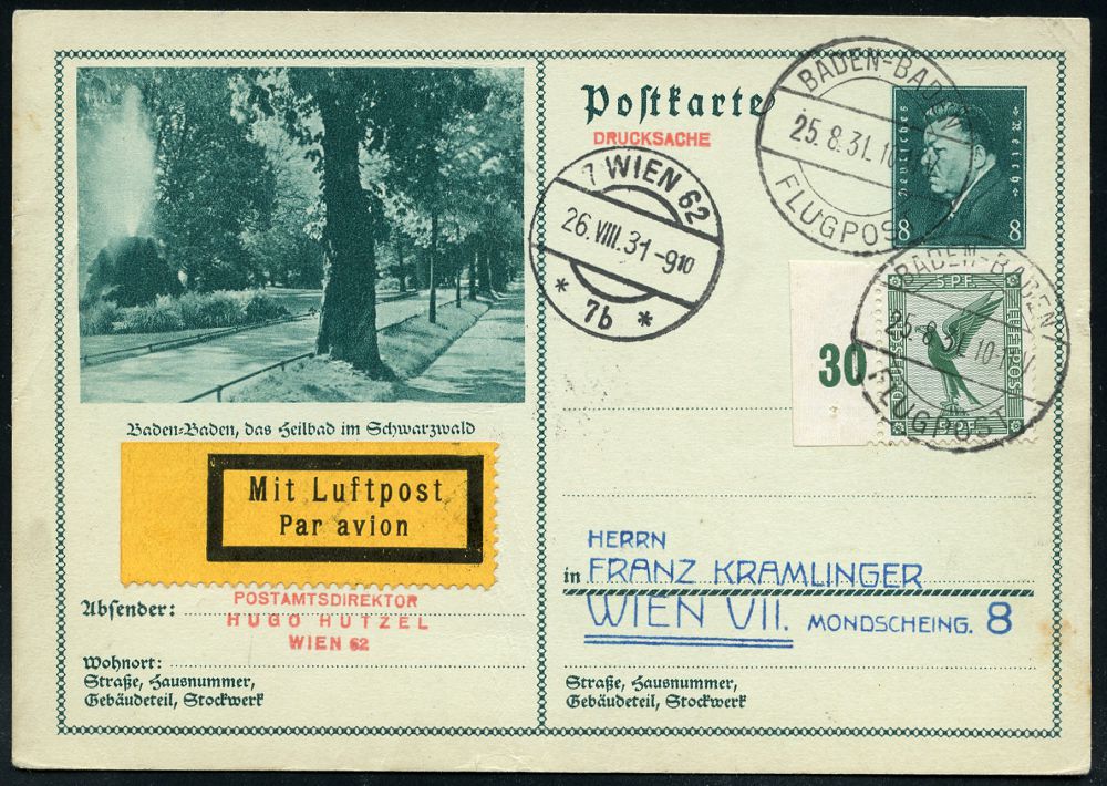 5055 | 25 € | POSTLEITRAUM 7500 (OHNE KARLSRUHE u. PFORZHEIM) : BADEN-BADEN/ FLUGPOST 1931 (25.8.) 1K-Brücke 2x auf ortsgleicher BiP 8 Pf. Ebert: Baden-Baden, das Heilbad.. (Mi.P192/03) + 5 Pf.Adler (Mi.378) + Minuten-AS 7 WIEN 62/*7b* = Rohrpost!, Ausl.-Flp-Kt! ,selene Kombination! (Mi.D 3) | ![]() | |