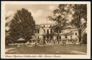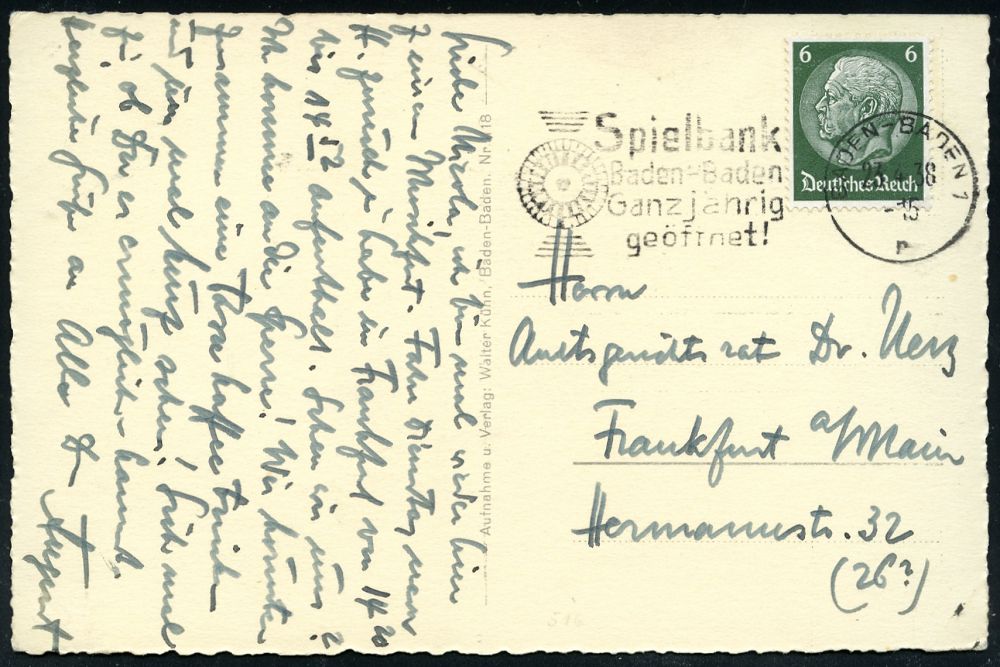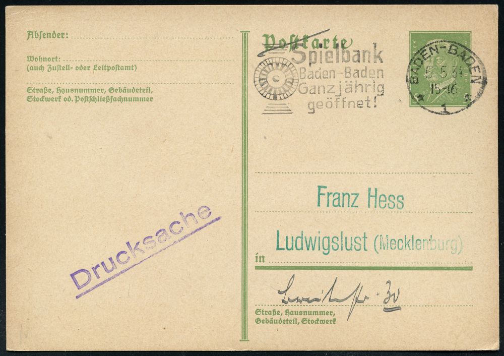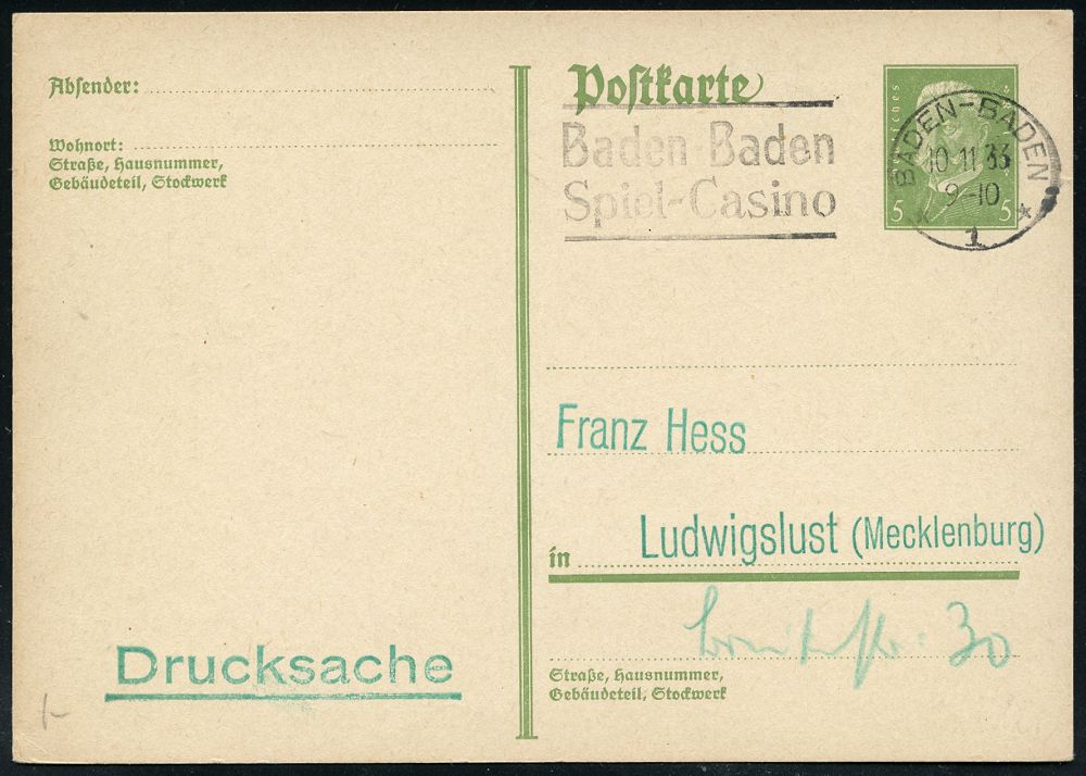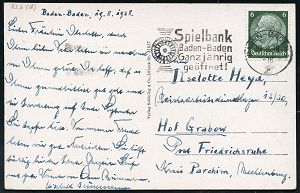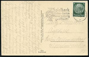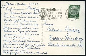 5056 | 14 € | POSTLEITRAUM 7500 (OHNE KARLSRUHE u. PFORZHEIM) : BADEN-BADEN/ *1*/ Spiel-Casino 1933 (10.11.) MWSt auf Inl.-KarteP (Bo.22 A / n u r 1933 verwendet) | ![]() | |