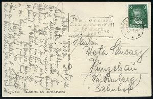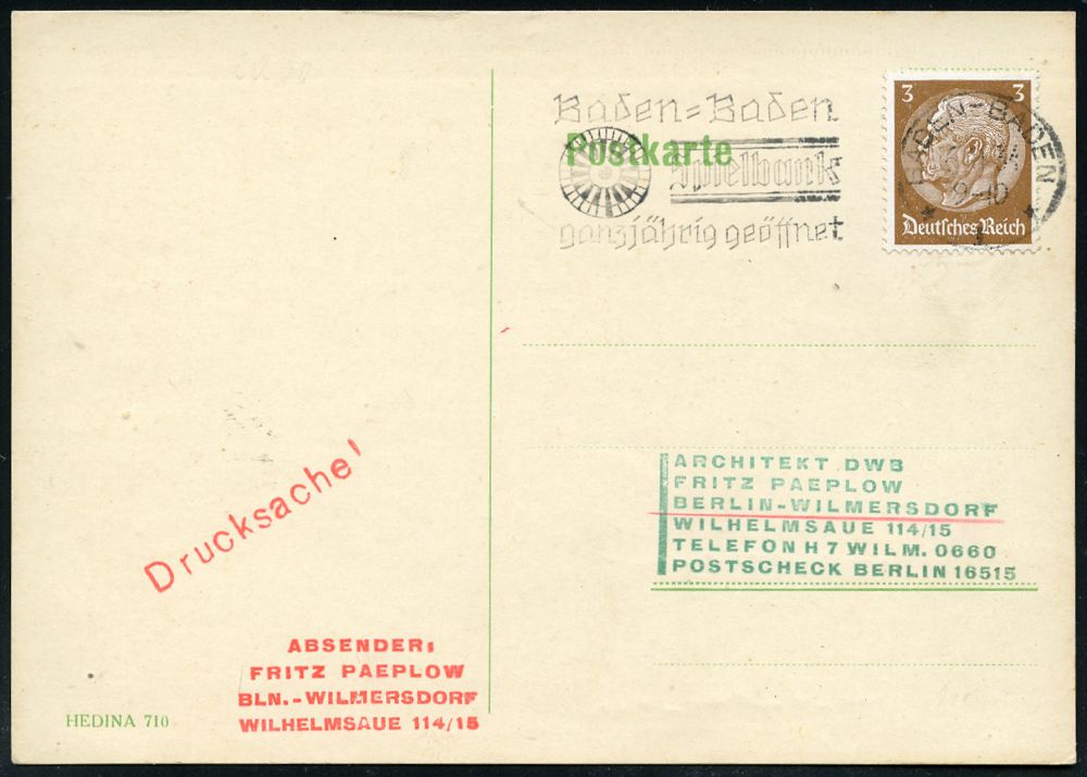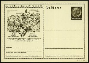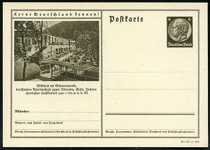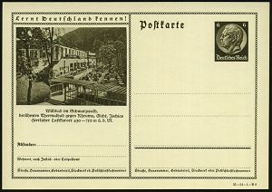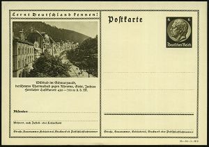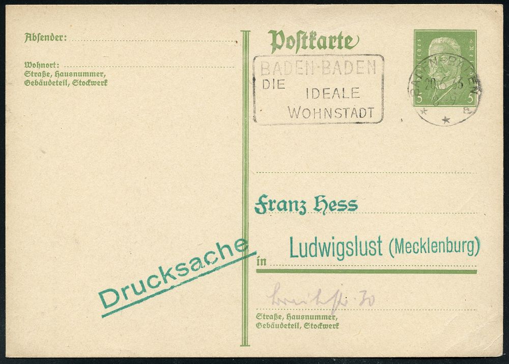 5057 | 14 € | POSTLEITRAUM 7500 (OHNE KARLSRUHE u. PFORZHEIM) : BADEN-BADEN/ **a/ DIE/ IDEALE/ WOHNSTADT 1933 (20.6.) MWSt auf Inl.-Karte (Bo.20 A I, n u r 1933 verwendet!) | ![]() | |