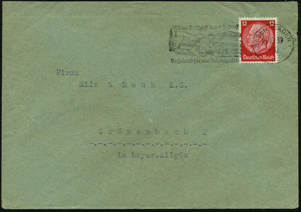 5068 | 14 € | POSTLEITRAUM 7500 (OHNE KARLSRUHE u. PFORZHEIM) : BADEN-BADEN 1/ r/ Mit der Kraftpost durch Baden!.. 1939 (18.10.) MWSt = Krafpostbus (im Schwarzwald) klar gest. Fern-Bf. (Bo.S 299 A , nur in 2 Orten verwendet!) | ![]() | |