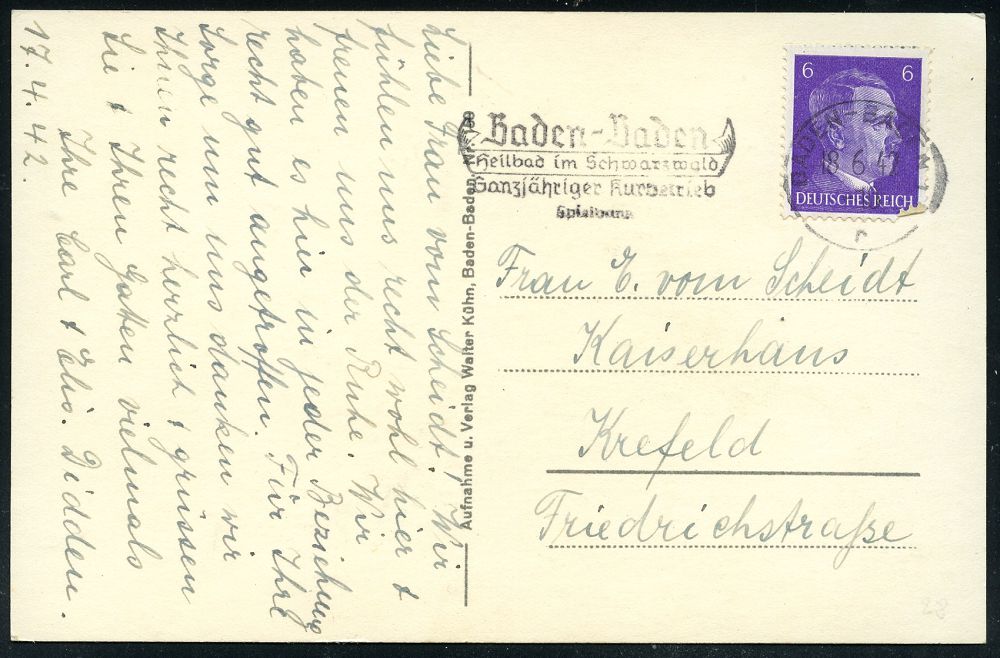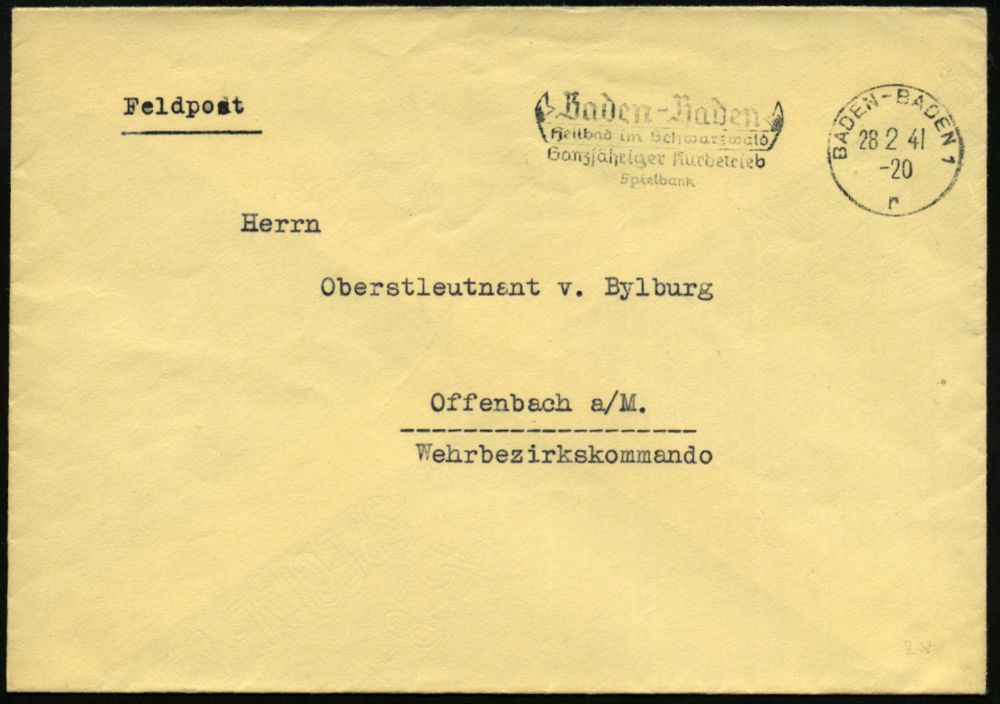 5069 | 15 € | POSTLEITRAUM 7500 (OHNE KARLSRUHE u. PFORZHEIM) : BADEN-BADEN 1/ r/ ..Heilbad im Schwarzwald/ Ganzjähriger Kurbetrieb/ Spielbank 1940 (28.2.) MWSt auf Feldpost-Bf., rs. Abs.:HAUS PAGENHARDT.. an Oberstleutnan von Bylburg in Offenbach (Bo.28 A I = Erstjahr) | ![]() ![]() | |