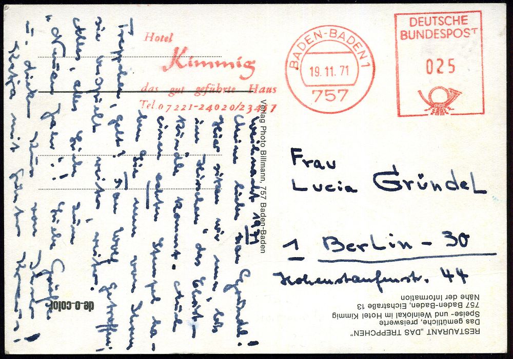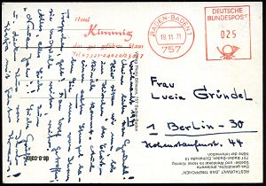 5081 | 20 € | POSTLEITRAUM 7500 (OHNE KARLSRUHE u. PFORZHEIM) : 757 BADEN-BADEN 1/ Hotel/ Kimmig/ das gut geführte Haus.. 1971 (19.11.) AFS Postalia 025 Pf. = Fremdnutzung eines Hotel-Freistemplers durch einen Gast! (sonst unzulässig) Bedarfs-Color-Ak.: Hotel Kimmig, Restaurant "Das Treppchen", Portostufe 025 Pf. nur 10 Monate möglich! (Dü.E-26B) | ![]() ![]() | |