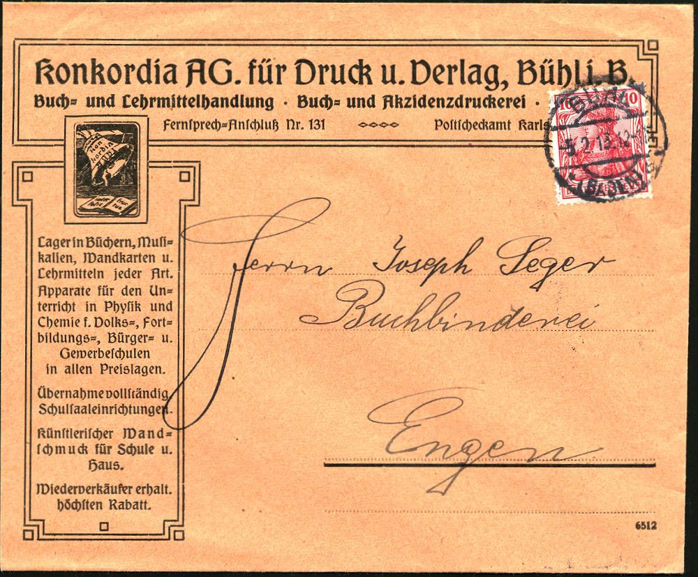 5105 | 18 € | POSTLEITRAUM 7500 (OHNE KARLSRUHE u. PFORZHEIM) : BÜHL/ *(BADEN)b 1913 (5.2.) 1K-Brücke auf rosa illustriertem Reklame-Bf.: Konkordia AG für Druck u.Verlag.. Akzidenzdruckerei (Glocke über Buch) dekorativer Inl.-Bf. (Mi.86 I) | ![]() | |