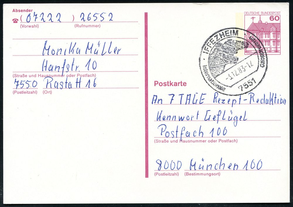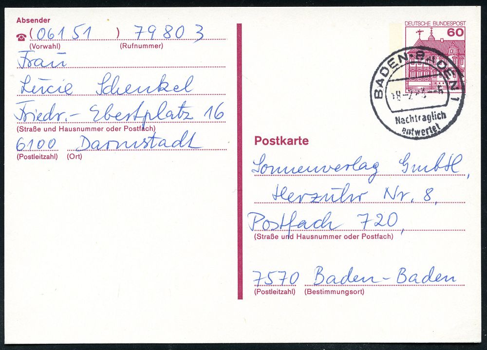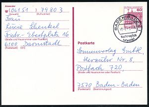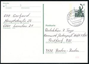 5084 | 6 € | POSTLEITRAUM 7500 (OHNE KARLSRUHE u. PFORZHEIM) : BADEN-BADEN 1/ Nachträglich/ entwertet 1983 1K-Segment ohne PLZ klar auf Inl.-P 60 Pf. Burgen, Bedarf | ![]() | |