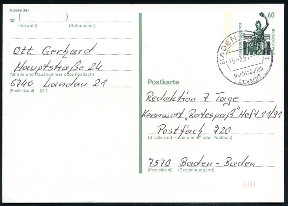 5087 | 6 € | POSTLEITRAUM 7500 (OHNE KARLSRUHE u. PFORZHEIM) : BADEN-BADEN 1/ Nachträglich/ entwertet 1991 1K-Segment ohne PLZ klar auf Inl.-P 60 Pf. Bavaria, Bedarf | ![]() | |