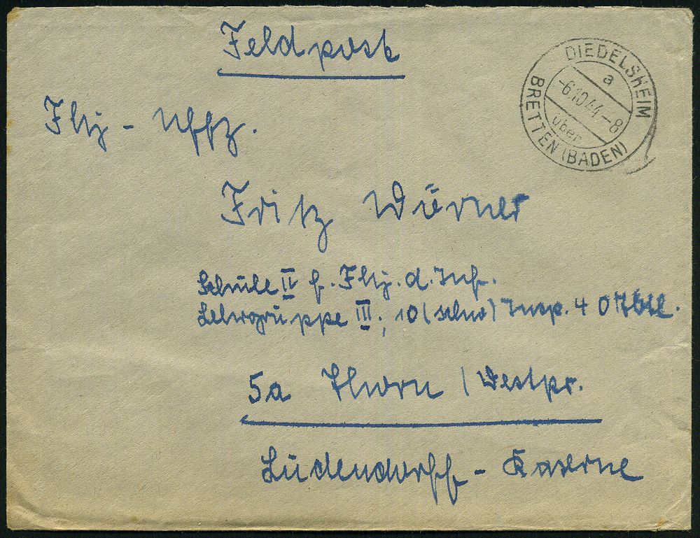 5114 | 16 € | POSTLEITRAUM 7500 (OHNE KARLSRUHE u. PFORZHEIM) : DIEDELSHEIM/ a/ über/ BRETTEN (BADEN) 1944 (6.10.) 2K-Steg = PSt.II , klar gest. Feldpost-Bf. + Inhalt an Führer-Schule der Jnfanterie, Thorn | ![]() ![]() | |