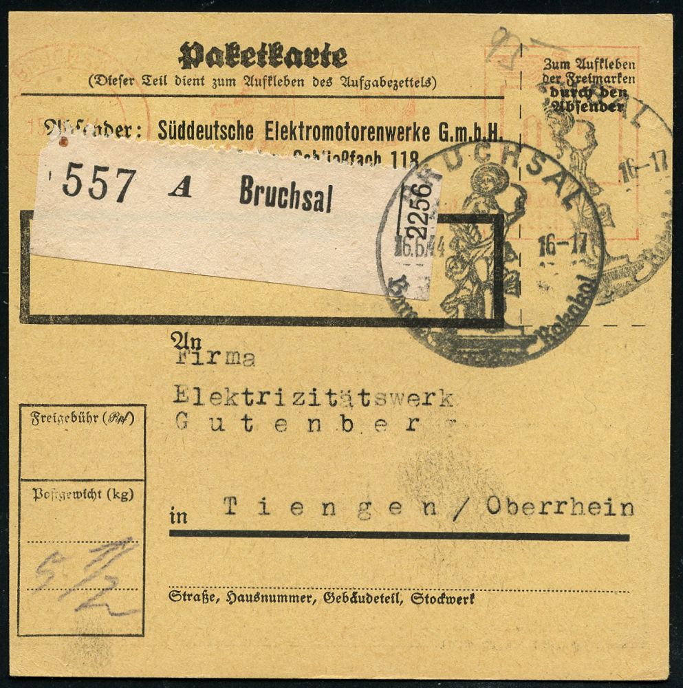 5098 | 20 € | POSTLEITRAUM 7500 (OHNE KARLSRUHE u. PFORZHEIM) : BRUCHSAL/ Barock/ Rokoko 1944 (6.6.) HWSt = weibliche Barock-Skulptur + AFS Francotyp 055 Pf. darüber schw. Paketzettel: A Bruchsal , Inl.-Paket-Kt.: Süddeutsche Elektromotorenwerke GmbH.. n. Tiengen-Gutenberg (kl. Rißchen geschl.) rs. 2 AS.: 2K-Steg + Landpost-Ra.2: Guten (Bo.7, Letztjahr!) | ![]() ![]() | |