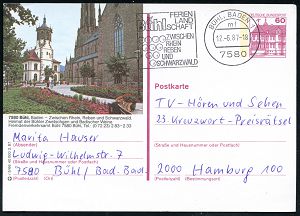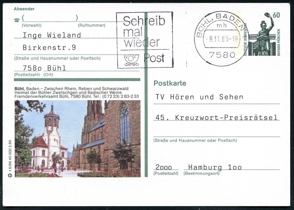 5111 | 14 € | POSTLEITRAUM 7500 (OHNE KARLSRUHE u. PFORZHEIM) : 7580 BÜHL.BADEN 1/ mh(Schreib/ mal/ wieder.. 1989 (9.11.) MaWSt auf ortsgleicher 60 Pf. BiP Bavaria: Bühl.. Heimat der Bühler Zwetschgen u. Weine.. , Bedarf!, seltene Kombination! (Mi.P 139) | ![]() | |