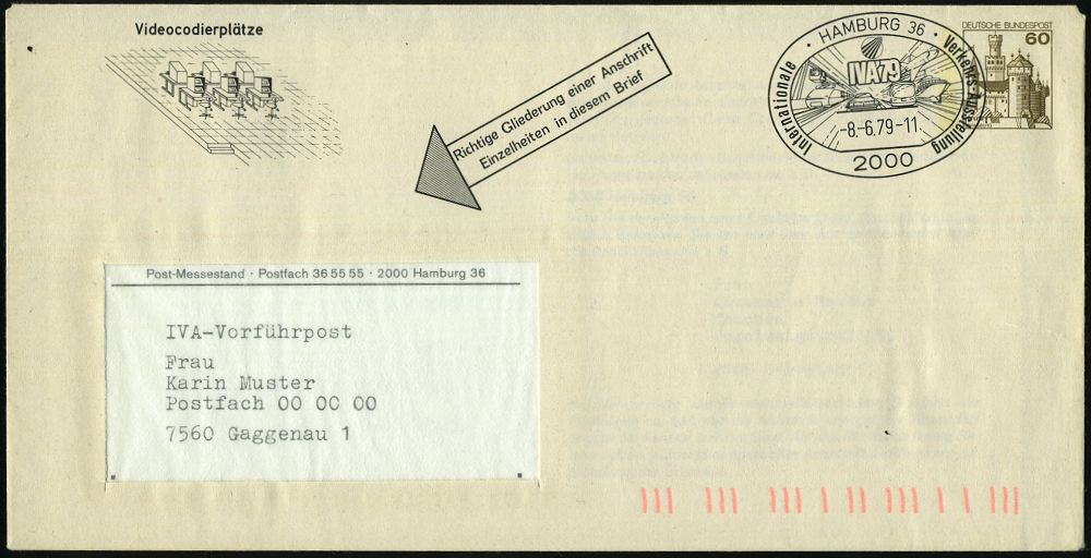 5129 | 16 € | POSTLEITRAUM 7500 (OHNE KARLSRUHE u. PFORZHEIM) : 7560 Gaggenau 1 1979 (8.6.) amtl. IVA-U 60 Pf. Burgen (Videocodierplätze) + gedruckter SSt.: 2000 HAMBURG 36/IVA.. (Verkehrsmittel) Langformat mit Fenster + Inhalt: "IVA-Vorführpost" + rosa Linearcode für PLZ 7560 Gaggenau = amtl. Sortieranlage auf der IVA, Postautomation! (ME.U V) | ![]() | |