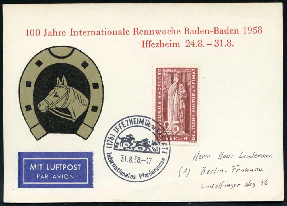 5148 | 18 € | POSTLEITRAUM 7500 (OHNE KARLSRUHE u. PFORZHEIM) : (17b) IFFEZHEIM über RASTATT/ Internat.Pferderennen 1958 (31.8.) SSt (Galopper) auf Sonder-Kt.: 100 Jahre Internat. Rennwoche.. (Michealis Nr.1) EF 25 Pf. Uta v.Naumburg (Berlin Mi.173 EF + 15.-EUR) portorichtige Inl.-Flp.-Karte n. West-Berlin! (Bo.3 / XII.Verwendung) | ![]() | |