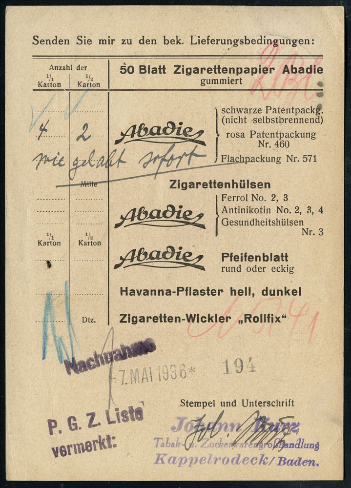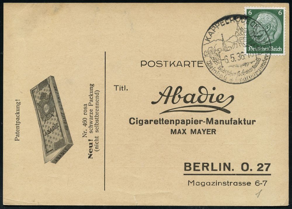 5157 | 16 € | POSTLEITRAUM 7500 (OHNE KARLSRUHE u. PFORZHEIM) : KAPPELRODECK/ ..Weinbau Spätburgunder 1938 (6.5.) HWSt (Ort m.Burg, Traube etc.) auf Reklame-Kt.: Abadie Cigaretten-Manufaktur.. (Zigarettenpapier) n. Berlin (Bo.1) | ![]() ![]() | |