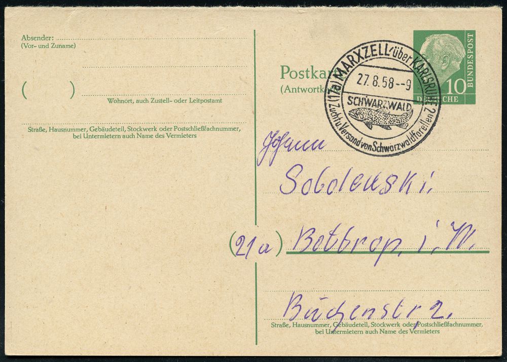 5161 | 15 € | POSTLEITRAUM 7500 (OHNE KARLSRUHE u. PFORZHEIM) : (17a) MARXZELL über KARLSRUHE 2/ Zucht u.Versand v.Schwarzwaldforellen 1958 (27.8.) HWSt (Forelle) auf Antwort-P 10 Pf. Heuss I (Mi.P 33 A, + 21.- EUR) klar gest.! (Bo.4 , Erstjahr) | ![]() | |