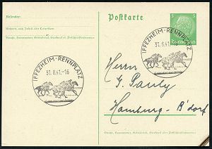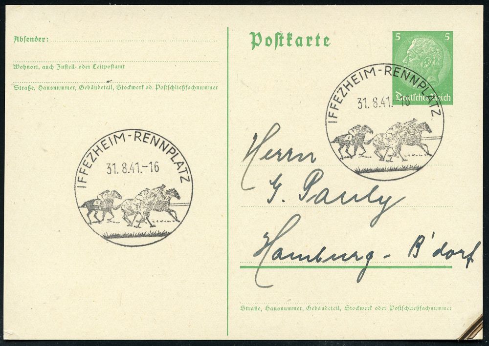 5147 | 16 € | POSTLEITRAUM 7500 (OHNE KARLSRUHE u. PFORZHEIM) : IFFEZHEIM-RENNPLATZ 1941 (31.8.) HWSt ohne Text (Galopper) = Saison-Hauspostamt Galopp-Rennbahn klar gest. Inl.-Karte (Bo.2, kriegsbedingt letzte Verwendung im III. Reich!) | ![]() | |