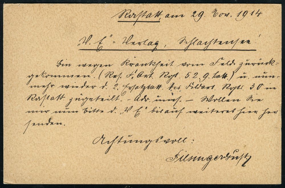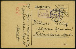 5167 | 11 € | POSTLEITRAUM 7500 (OHNE KARLSRUHE u. PFORZHEIM) : RASTATT/ *2a 1914 (30.11.) 1K-Brücke + vio. Ra.3: .. II. Ersatz-Batterie/Feld-Art. Rgts. 30 + hs. Abs., Feldpost-Kt. n. Berlin | ![]() ![]() | |