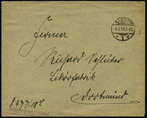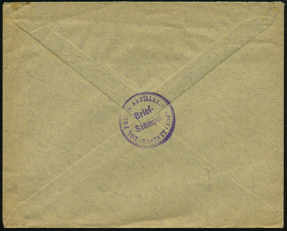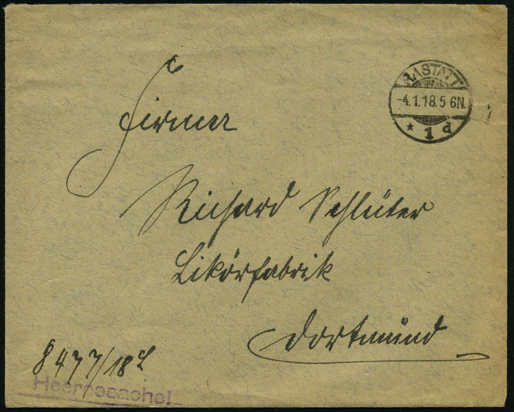 5168 | 12 € | POSTLEITRAUM 7500 (OHNE KARLSRUHE u. PFORZHEIM) : RASTATT/ *1d 1918 (4.1.) 1K-Gitterbrücke + viol. 1L: Heeressache!, rs. viol. 2K-HdN: KGL. PREUSS. ARTILLERIEDEPOT/RASTATT , kla gest. Militär-Dienst-Bf. n. Dortmund (an Likörfabrik Schlüter!) | ![]() ![]() | |