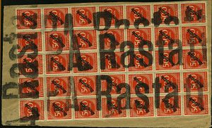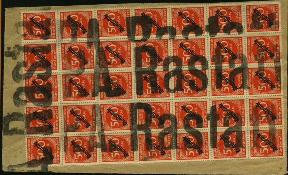 5169 | 20 € | POSTLEITRAUM 7500 (OHNE KARLSRUHE u. PFORZHEIM) : Rastatt 1923 großer Päckchen-1L = Infla-Notstempel, mehrfach auf Massenfrankatur Dienst 500 Mk. rot (35 Stück) auf Päckchenausschnitt (Mi.D 81 MeF) | ![]() | |
