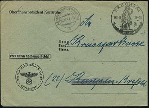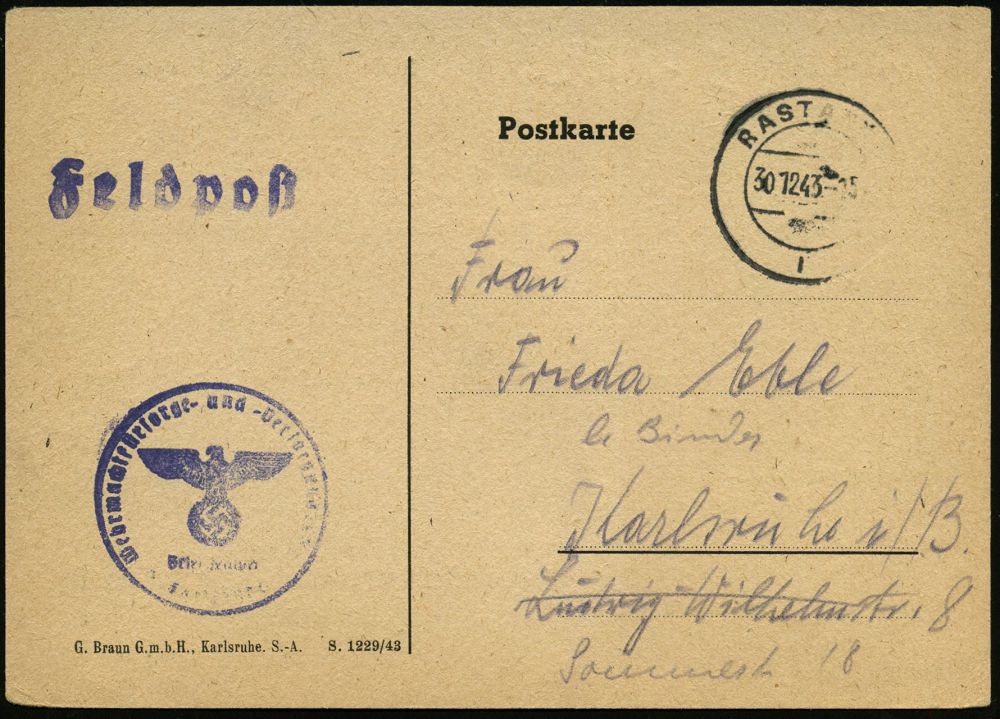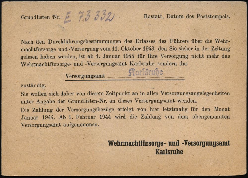 5172 | 16 € | POSTLEITRAUM 7500 (OHNE KARLSRUHE u. PFORZHEIM) : Rastatt 1943 (30.12.) 2K-Steg.: RASTATT (rechts nicht ganz voll) + viol. 1L: Feldpost + 1K: Wehrmachtsfürsorge- u. Versorgungsamt/Karlsruhe (ausgelagert?) rs. Vordruck über Zuständigkeitsverlagerung an zivile Behörde (Versorgungsamt Karlsruhe) nachgesandte Fernkt. | ![]() ![]() | |