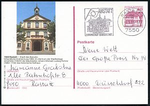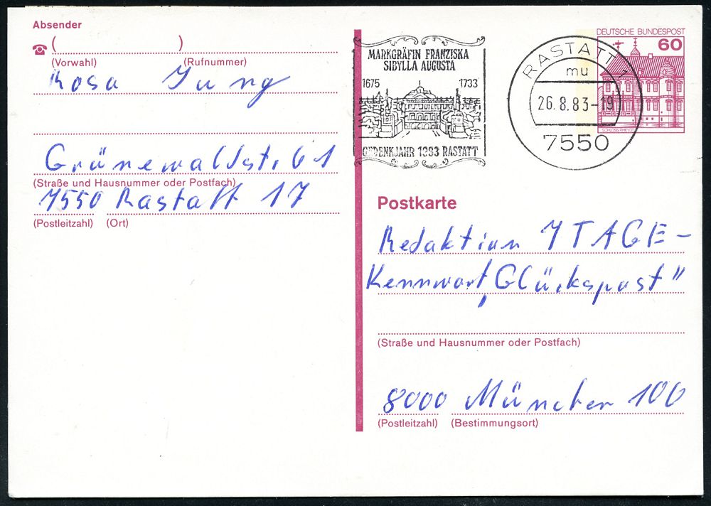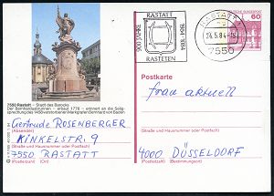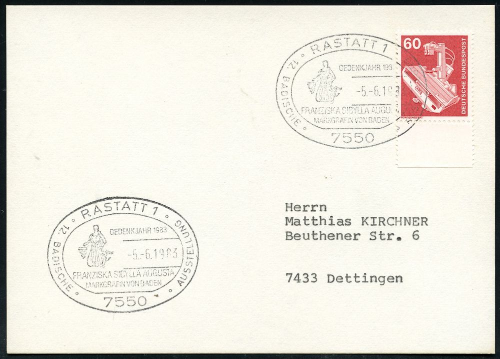 5177 | 6 € | POSTLEITRAUM 7500 (OHNE KARLSRUHE u. PFORZHEIM) : 7550 RASTATT 1/ GEDENKJAHR../ FRANZISKA SIBYLLA AUGUSTA/ MARKGRÄFIN VON BADEN.. 1983 (5.6.) SSt vom Finaltag (Figur der Markgräfin) Inl.-Karte (Bo.25) | ![]() | |