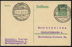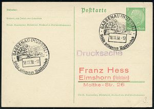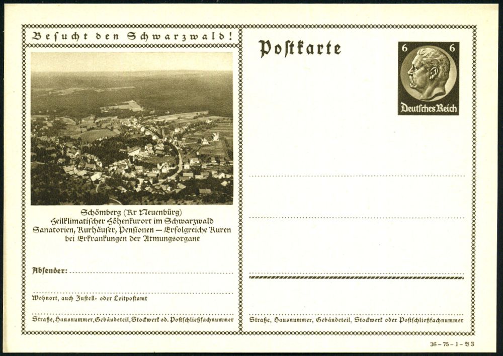 5193 | 10 € | POSTLEITRAUM 7500 (OHNE KARLSRUHE u. PFORZHEIM) : Schömberg (Kr Neuenbürg) 1936 6 Pf. BiP Hindenbg., braun, , Sonderform: "Besucht den Schwarzwald!" (Ortsbild), ungebr. (Mi.P 236/36-75-1-B 3) | ![]() | |