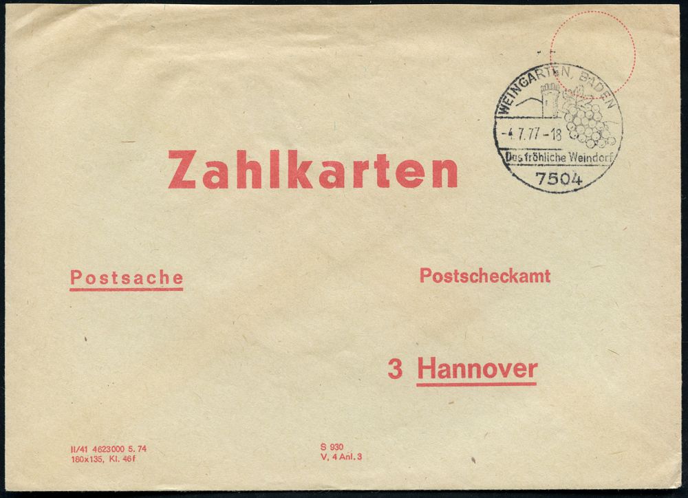 5200 | 15 € | POSTLEITRAUM 7500 (OHNE KARLSRUHE u. PFORZHEIM) : 7504 WEINGARTEN,BADEN/ Das fröhliche Weindorf 1977 (4.7.) HWSt = Weintraube (u. Wartturm) klar auf PSch-Innendienst-Bf. "Zahlkarten" (rot/grün für Zahlkartenaustausch!), seltene Verwendung! (Bo.3) | ![]() | |