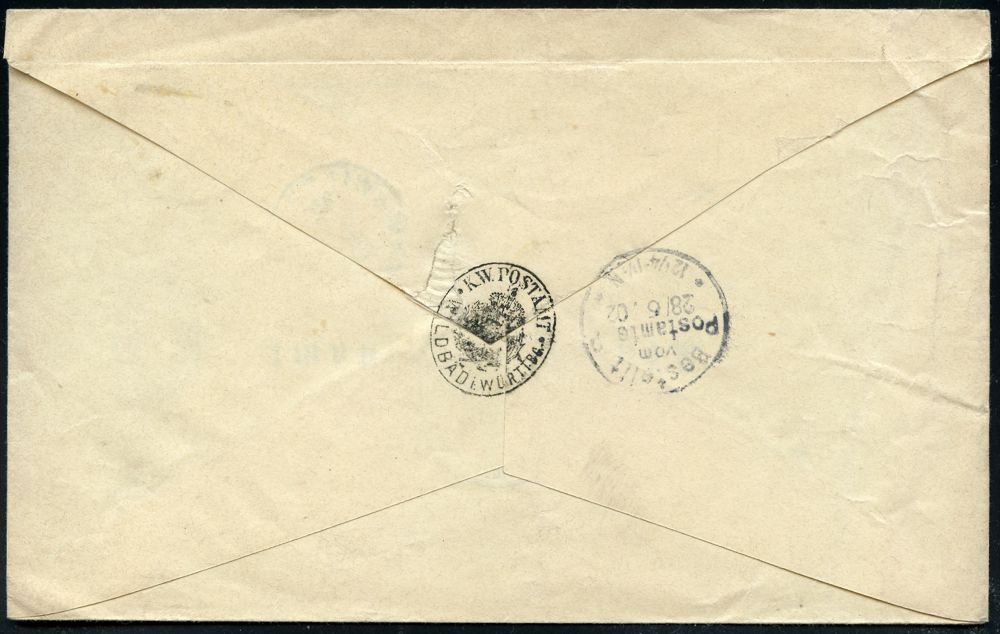 5202 | 15 € | POSTLEITRAUM 7500 (OHNE KARLSRUHE u. PFORZHEIM) : WILDBAD/ Bhof.*/ in WÜRTTEMB. 1902 (27.6.) 1K auf doppelt verwendetem Post-Dienst = sogen. "Wende-Bf", rs. Oval-HdN: K. W. POSTAMT / WILDBAD.. (rs. Klappenriß geschl.) n. Berlin | ![]() ![]() | |