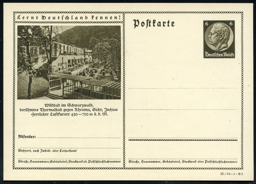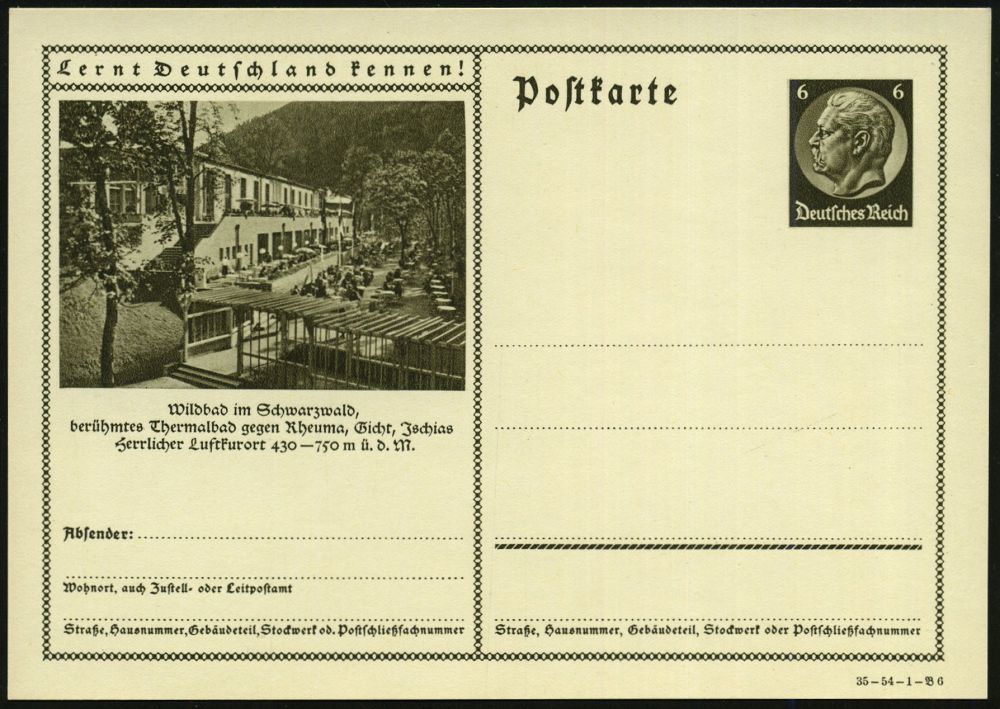 5203 | 20 € | POSTLEITRAUM 7500 (OHNE KARLSRUHE u. PFORZHEIM) : Wildbad Schwarzwald 1935 6 Pf. BiP Hindenbg., braun: Thermalbad gegen Rheuma, Gicht, Jschias ,3 verschiedene (2 verschiedene Bilder), je ungebr. (Einzelverkauf möglich: je 8.- EUR) 3 Belege (Mi.P 236/35-54- Bild 3, 6 und 9) | ![]() ![]() ![]() | |