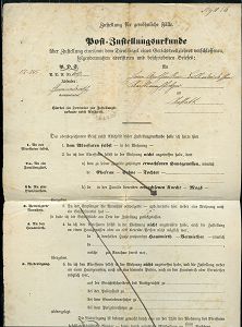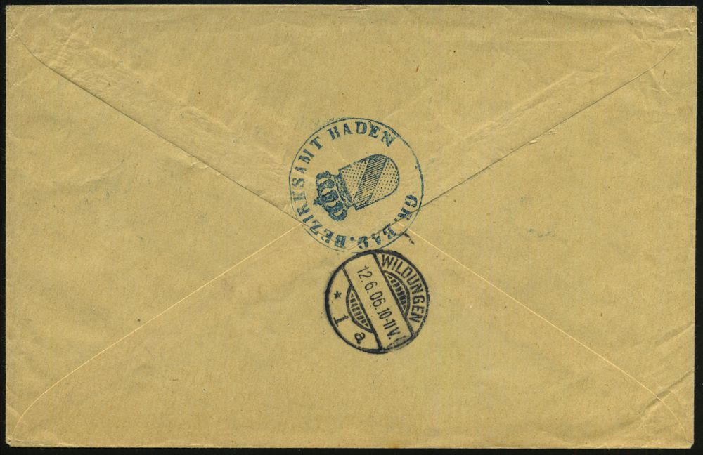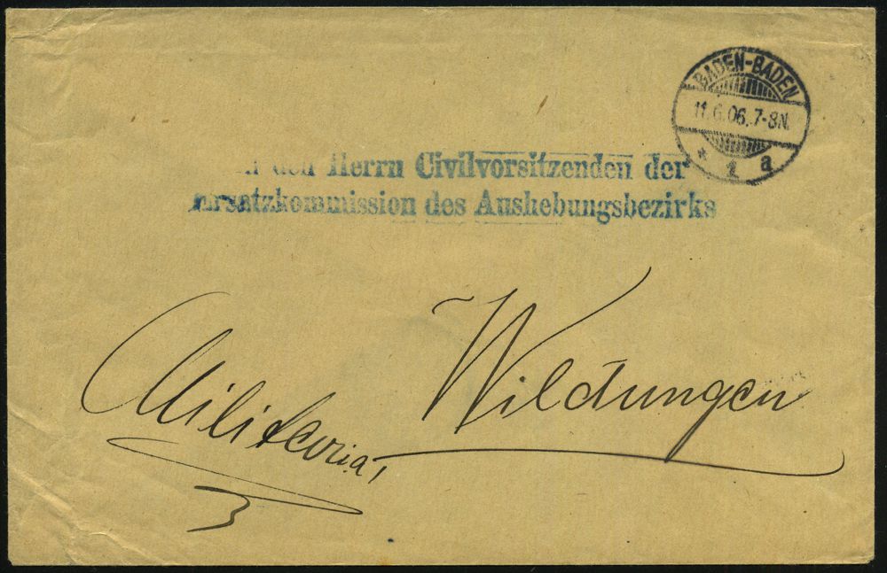 5034 | 18 € | POSTLEITRAUM 7500 (OHNE KARLSRUHE u. PFORZHEIM) : BADEN-BADEN/ *1a 1906 (11.6.) 1K-Gitter-Brücke + hs. "Militaria", rs. blauer Siegel-HdN: GR. BAD. BEZIRKSAMT BADEN (Wappen) portofreier Militärdienst-Bf. n. Bad Wildungen (an Musterungs-Amt) | ![]() ![]() | |