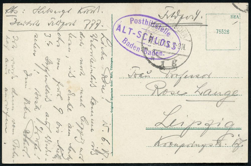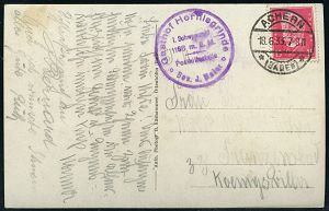 5036 | 15 € | POSTLEITRAUM 7500 (OHNE KARLSRUHE u. PFORZHEIM) : BADEN-BADEN/ *1g 1917 (5.6.) 1K-Brücke + viol. Oval-HdN: Posthilfsstelle/ALT-SCHLOSS.. auf s/w.-Feldpost-Foto-Ak.: Schloß! (ha. Fp. Amt 777) n. Leipzig | ![]() ![]() | |