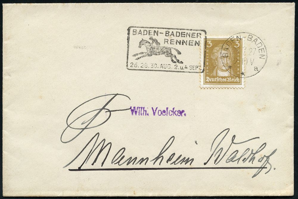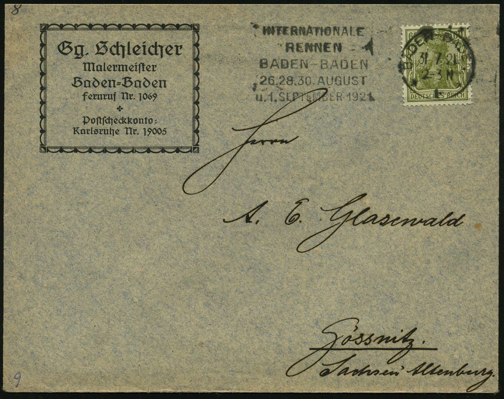 5037 | 20 € | POSTLEITRAUM 7500 (OHNE KARLSRUHE u. PFORZHEIM) : BADEN-BADEN/ *1*/ INTERNAT./ RENNEN/ ..26.28.30.AUG./ u.1.SEPT. 1921 (31.7.) MWSt auf EF 60 Pf. Germania, oliv , sauber gest. Firmen-Inl.Bf.: Gg. Schleicher, Malermeister.. (Bo.2 A) | ![]() | |