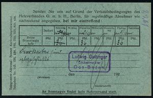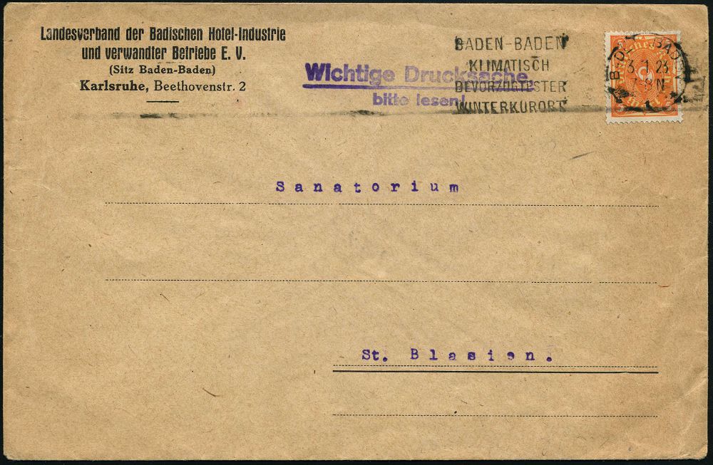 5044 | 16 € | POSTLEITRAUM 7500 (OHNE KARLSRUHE u. PFORZHEIM) : BADEN-BADENN/ *1*/ KLIMATISCH/ BEVORZUGTER/ WINTERKURORT 1923 (3.1.) MWSt auf Vordruck-Bf.: Landesverband der Badischen Hotel-Industrie.. (Bo.4 A , Bochmann nur 1921-22 bekannt!) | ![]() | |