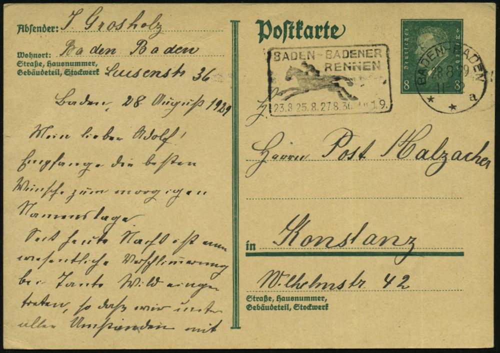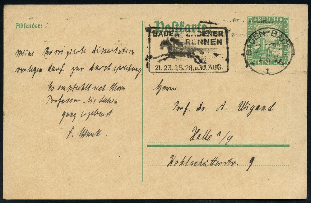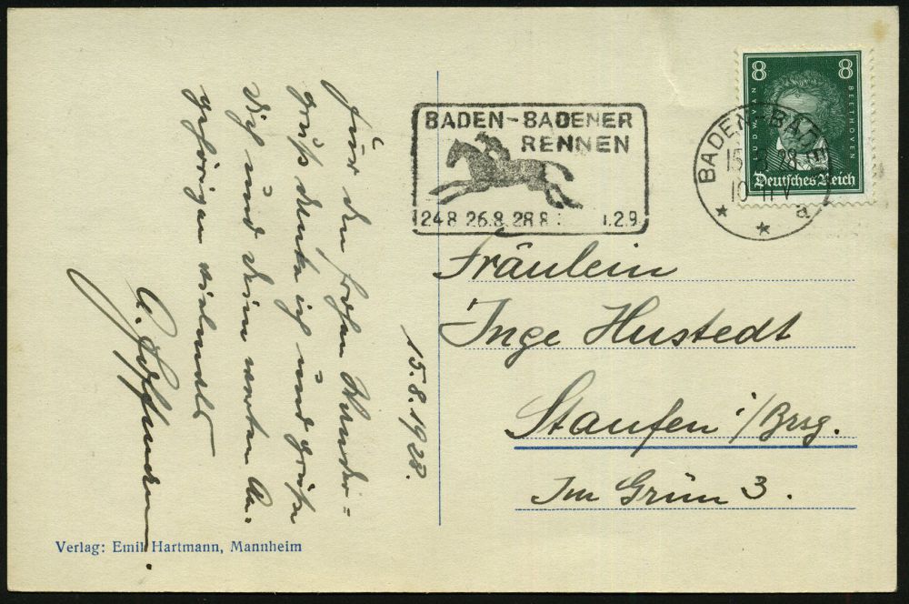 5054 | 14 € | POSTLEITRAUM 7500 (OHNE KARLSRUHE u. PFORZHEIM) : BADEN-BADEN/ **a/ BADEN-BADENER/ RENNEN/ 23.8. 25.8. 27.8. 30.8.u.1.9. 1929 (28.8.) MWSt aus der Renn-Saison! = Galopper , klar gest. Bedarfs-Inl.-Karte (Bo.14 A) | ![]() | |