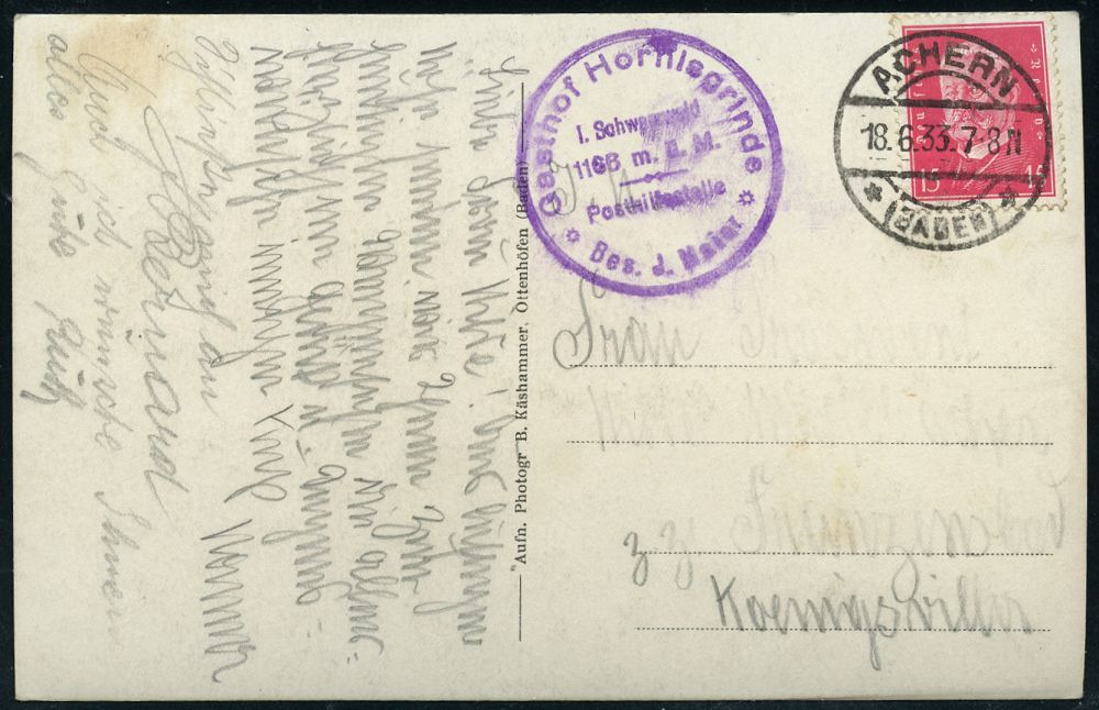 5028 | 12 € | POSTLEITRAUM 7500 (OHNE KARLSRUHE u. PFORZHEIM) : ACHERN/ *(BADEN)* 1933 (18.6.) 1K-Brücke + viol. 1K-HdN: Gasthof Hornisgrinde.. 1166 m. ü. M.. auf passender s/w.-Foto-Ak.: Hornisgrinde mit Aussichtsturm, (Adr. etw. schwach) Bedar | ![]() ![]() | |