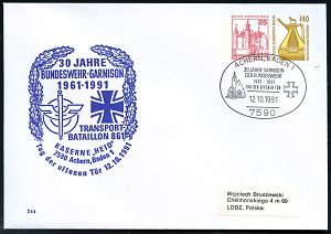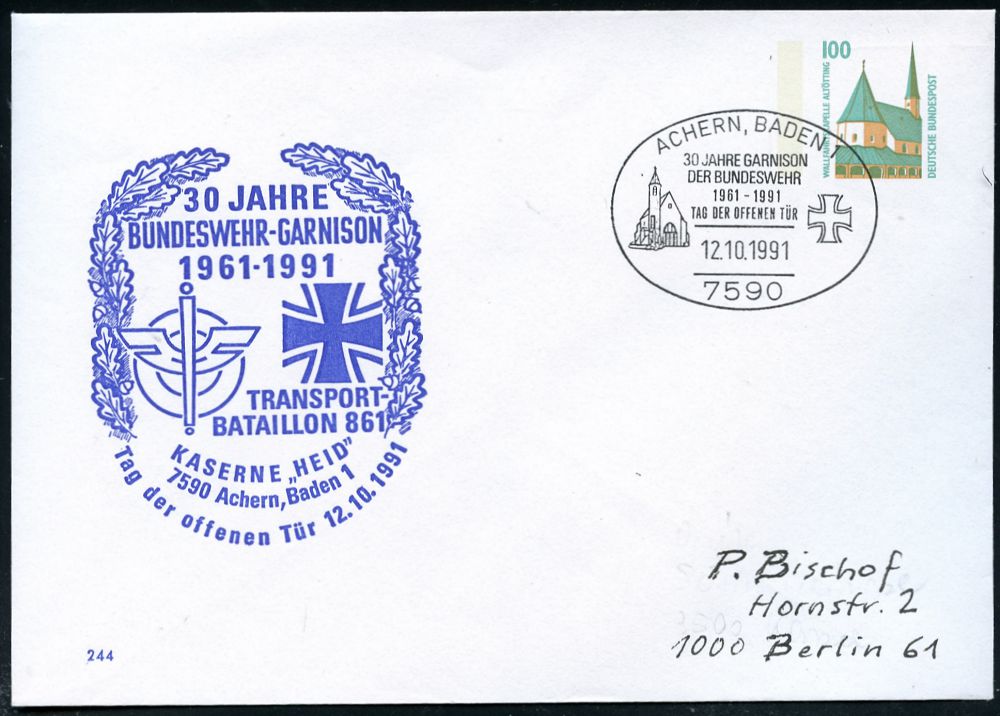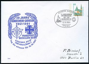 5031 | 10 € | POSTLEITRAUM 7500 (OHNE KARLSRUHE u. PFORZHEIM) : 7590 ACHERN,BADEN 1/ 30 JAHRE GARNISON/ DER BUNDESWEHR.. 1991 (12.10.) SSt auf passender PU 100 Pf. Bauwerke: 30 JAHRE BUNDESWEHR-GARNISON.. TRANSPORT BATL. 861 (Abzeichen u. Eisernes Kreuz) Inl.-Bf. (Mi.PU 290) | ![]() | |