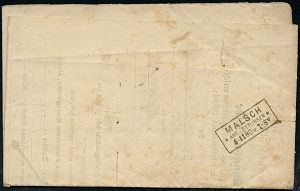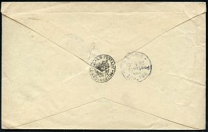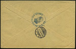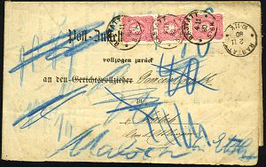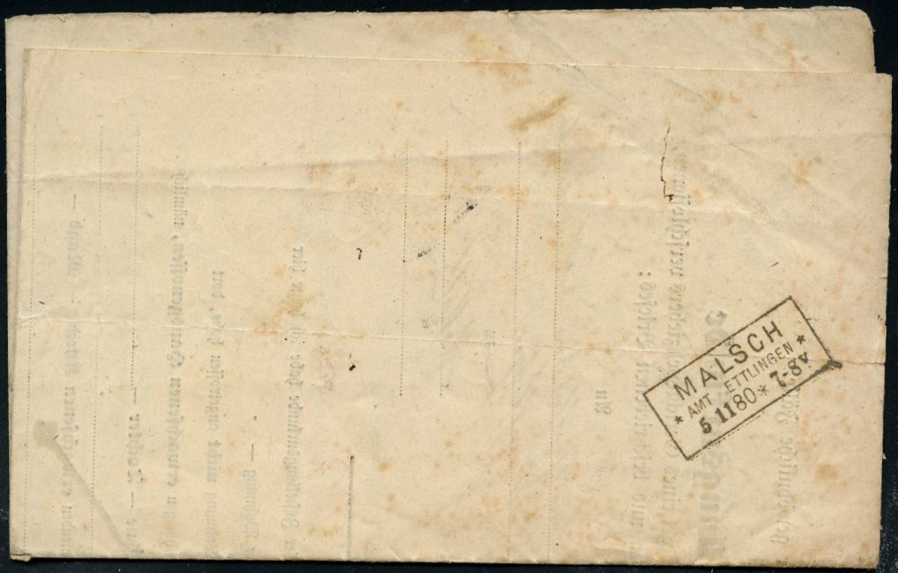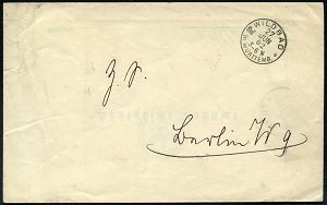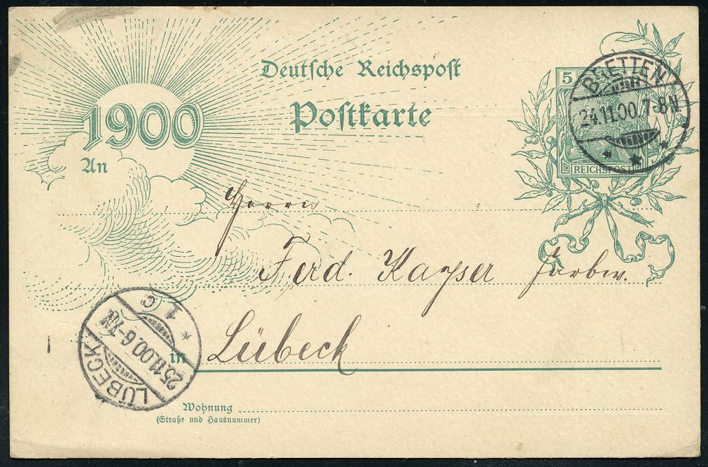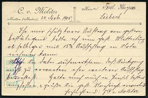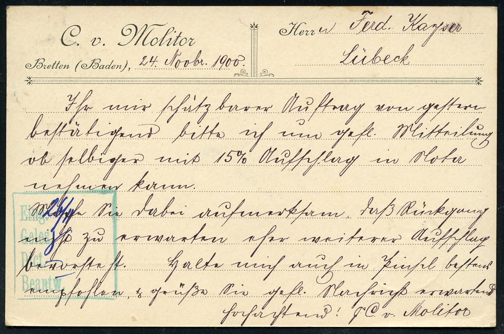 5090 | 20 € | POSTLEITRAUM 7500 (OHNE KARLSRUHE u. PFORZHEIM) : BRETTEN / *** 1900 (22.5.) 1K-Gitter auf Jahrhdt.-P 5 Pf. "1900" Germania + rs. Absender-Zudruck: C. v. Molitor, Bretten.. , Fern-Kt. n. Lübeck, vs. AS. (Mi.PZD 43) | ![]() ![]() | |