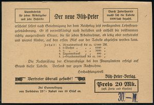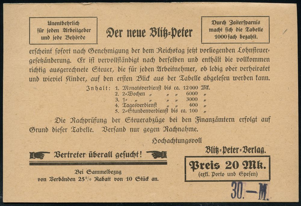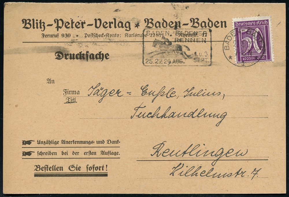 5040 | 16 € | POSTLEITRAUM 7500 (OHNE KARLSRUHE u. PFORZHEIM) : BADEN-BADEN/ *1*/ ..RENNEN/ 25.27.29.AUG./ 1.u.3./ SEPT. 1922 (22.8.) MWSt = Galopper , sauber gest. (halbe) Reklame-Kt.: Blitz-Peter-Verlag.. "Der neue Blitz-Peter"... ohne Antwortteil n. Reutlingen (Bo.6 A) | ![]() ![]() | |