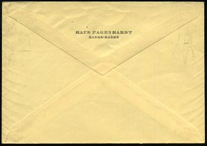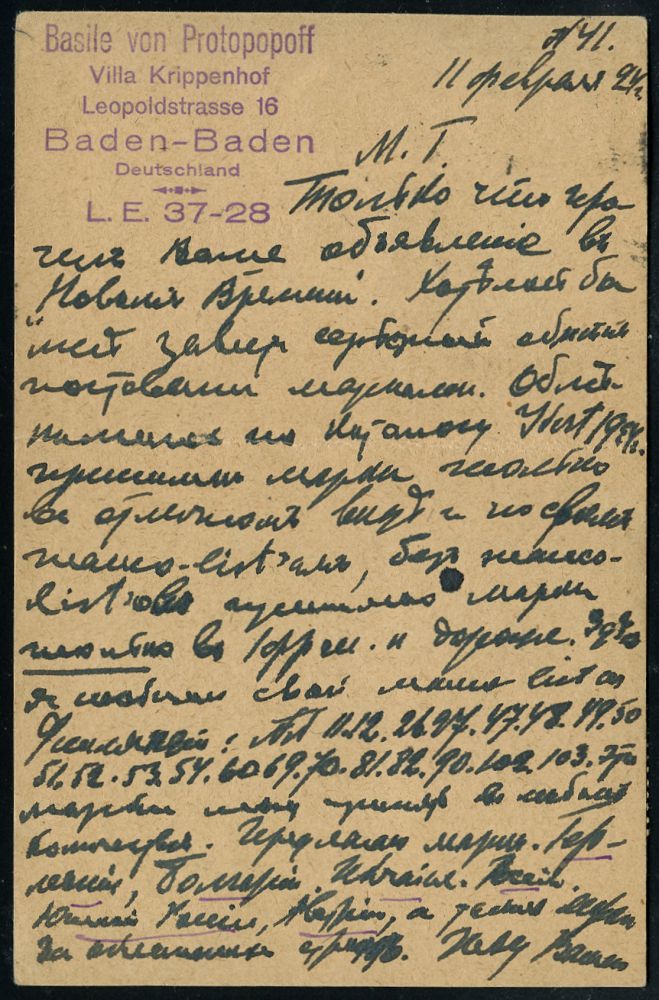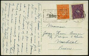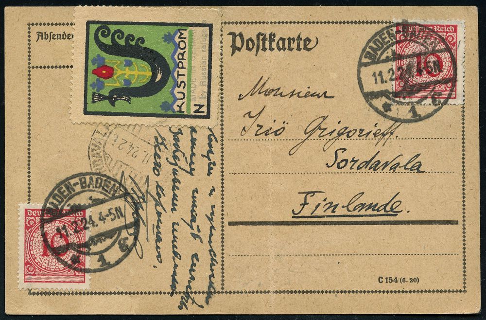 5045 | 16 € | POSTLEITRAUM 7500 (OHNE KARLSRUHE u. PFORZHEIM) : BADEN-BADEN/ *1g 1924 (11.2.) 1K-Brücke 2x auf 2x 10 Pf. Korbdeckel + seltene Color-Vignette. KUNSTPROM , rs. viol. Abs.-HdN: Basile von Protopopoff, Villa Krippenhof.., klar gest. Ausl.-Kt. (Mittelbugspur) n. Finnland mit russischen Text (Mi.340 MeF) | ![]() ![]() | |